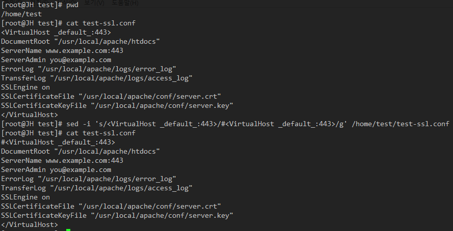 잘못된 예시 ex3) sed -i 's/DocumentRoot "/usr/local/apache/htdocs"/#DocumentRoot "/usr/local/apache/htdocs"/g' /home/test/test-ssl.conf