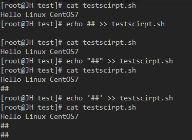 #는 특수문자로 echo ##하면 공백처리로 인식되어 결과적으로 아무것도 실행되지 않습니다. 그렇기 때문에 #는 보통 주석처리로 이용되는 부분을 스크립트파일에 문자 그대로 넣기위해서는 "(쌍따옴표), '(따옴표)를 사용하여 감싸야합니다.