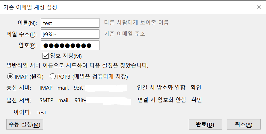 그리고 앞서 설정한 sendmail, dovecot 의 설정에 의해서 인증서 안함 / 암호화 안함으로 설정됩니다.