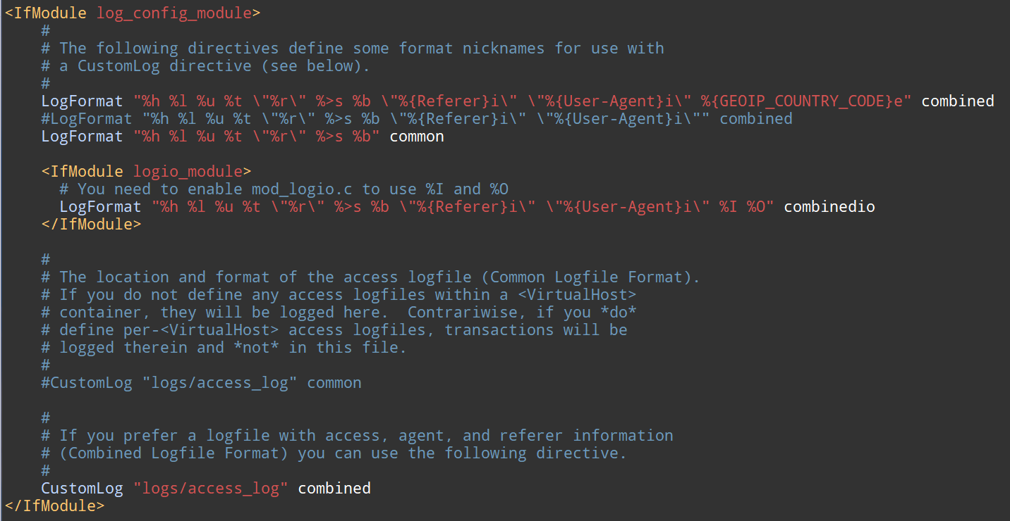 | <IfModule log_config_module> # # The following directives define some format nicknames for use with # a CustomLog directive (see below). # LogFormat "%h %l %u %t \"%r\" %>s %b \"%{Referer}i\" \"%{User-Agent}i\" %{GEOIP_COUNTRY_CODE}e" combined #LogFormat "%h %l %u %t \"%r\" %>s %b \"%{Referer}i\" \"%{User-Agent}i\"" combined LogFormat "%h %l %u %t \"%r\" %>s %b" common <IfModule logio_module> # You need to enable mod_logio.c to use %I and %O LogFormat "%h %l %u %t \"%r\" %>s %b \"%{Referer}i\" \"%{User-Agent}i\" %I %O" combinedio </IfModule> # # The location and format of the access logfile (Common Logfile Format). # If you do not define any access logfiles within a <VirtualHost> # container, they will be logged here. Contrariwise, if you *do* # define per-<VirtualHost> access logfiles, transactions will be # logged therein and *not* in this file. # #CustomLog "logs/access_log" common # # If you prefer a logfile with access, agent, and referer information # (Combined Logfile Format) you can use the following directive. # CustomLog "logs/access_log" combined </IfModule> |