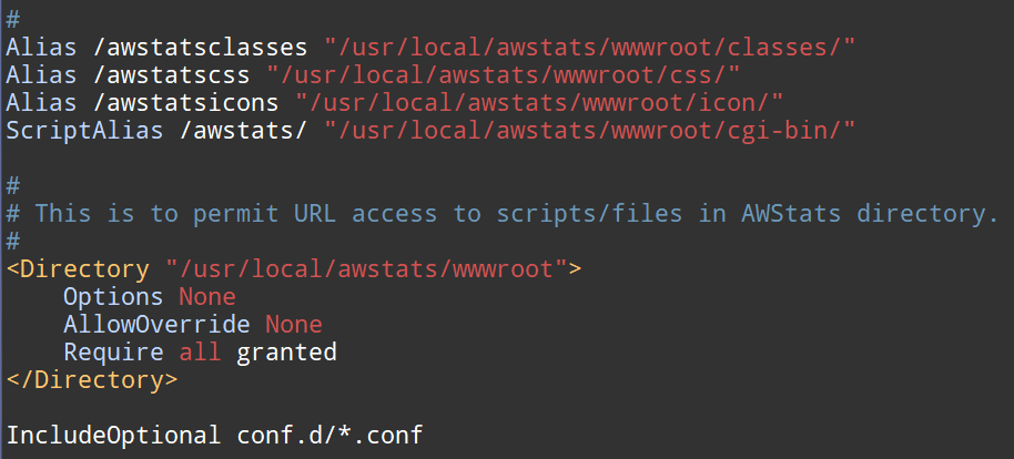 | IncludeOptional conf.d/*.conf Alias /awstatsclasses "/usr/local/awstats/wwwroot/classes/" Alias /awstatscss "/usr/local/awstats/wwwroot/css/" Alias /awstatsicons "/usr/local/awstats/wwwroot/icon/" ScriptAlias /awstats/ "/usr/local/awstats/wwwroot/cgi-bin/" # # This is to permit URL access to scripts/files in AWStats directory. # <Directory "/usr/local/awstats/wwwroot"> Options None AllowOverride None Order allow,deny Allow from all </Directory> |