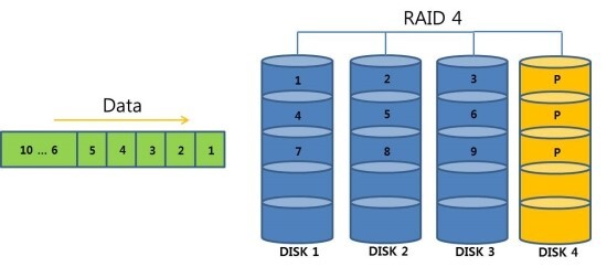 단점 : Parity 전용 디스크에 부하가 걸릴 경우(Parity 연산을 해야하는 경우가 많을수록) 전체적인 성능이 저하됨.읽기 보다는 쓰기에서 성능의 저하가 큼(디스크에 쓸 때는 Parity를 연산하여 기록해야 하기 때문에, 읽기때는 데이터만 읽으면 됨)