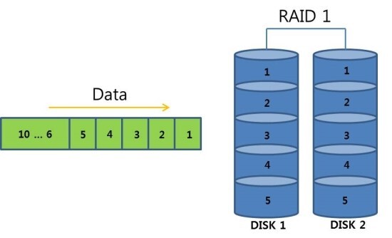 아래 그림에서 보면 1번 조각이 디스크에 쓰여질 때 양쪽 디스크(DISK1, DISK2)에 동시에 동일한 데이터가 기록됨을 볼 수 있다.