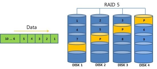 RAID 5는 3개 이상의 디스크가 필요하지만 성능상의 이유로 적어도 5 개의 디스크를 사용하는 것이 좋다고 한다.