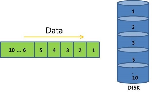 RAID 0의 경우는 I/O가 일어날때 데이터를 여러 조각으로 나누어 각각의 디스크에 순서대로 저장하게 된다.