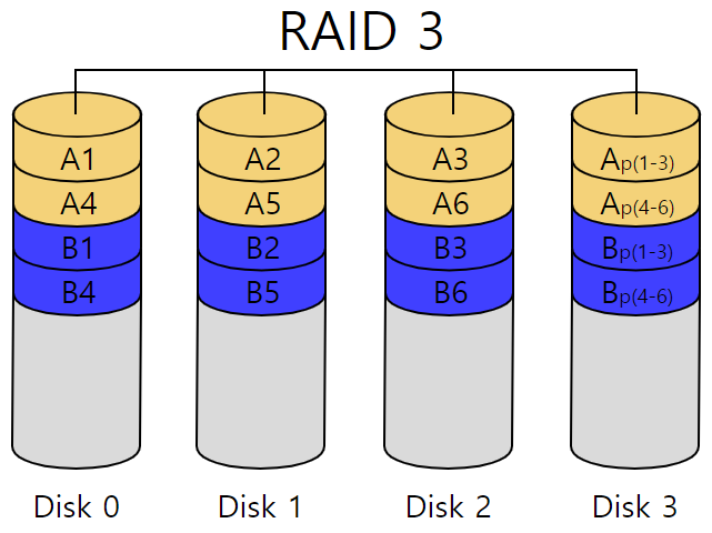Byte 단위로 striping을 하고, error correction을 위해 전용 패리티 디스크를 1개 사용합니다. 나머지 디스크에 데이터를 균등하게 분산 저장하는 방식이다. 읽기 성능은 RAID 0과 비슷하나 쓰기는 패러티 처리로 인해 일부 성능 저하가 있다. 용량 및 성능이 단일 디스크 대비 (N-1) 배 증가합니다. Byte 단위로 striping 하기 때문에 너무 작게 쪼개져 현재는 사용하지 않는다고 합니다.