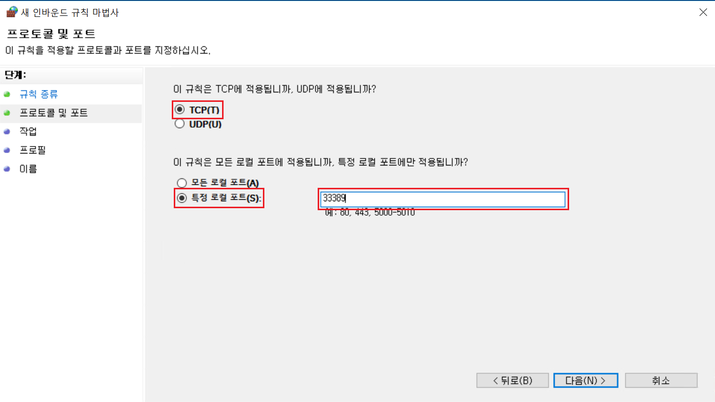 4. 포트를 선택 한 후 "TCP"를 먼저 선택한 후 "특정 로컬 포트"에 "33389" 입력 후 "연결 허용" 후 규칙은 "도메인, 개인, 공용" 전부 체크 후 이름에 "원격데스크탑(TCP)" 입력