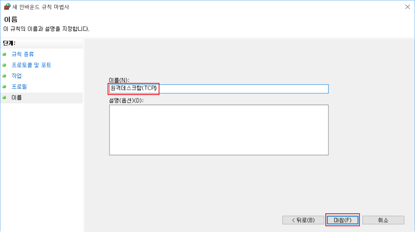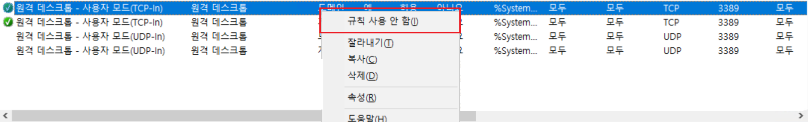 6. 기존의 설정된 원격데스크탑 방화벽 설정을 사용안함으로 해야합니다.