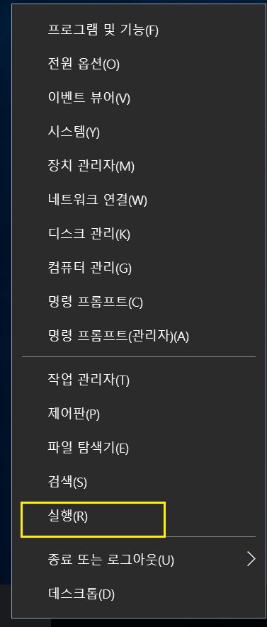 1. 시작메뉴에서 오른쪽 마우스로 실행 클릭