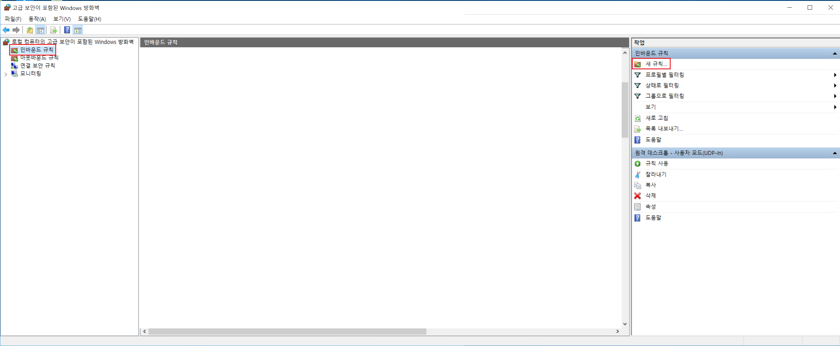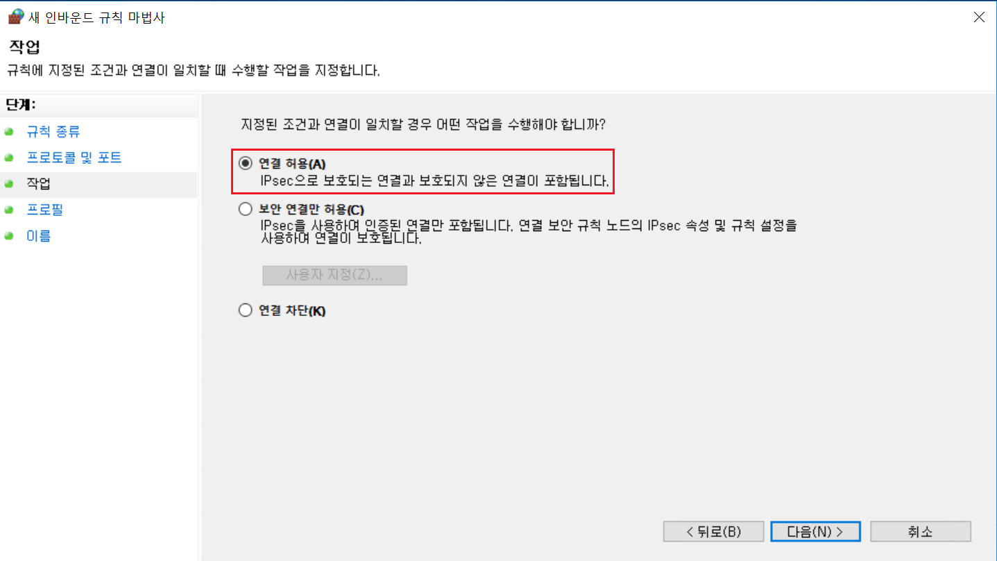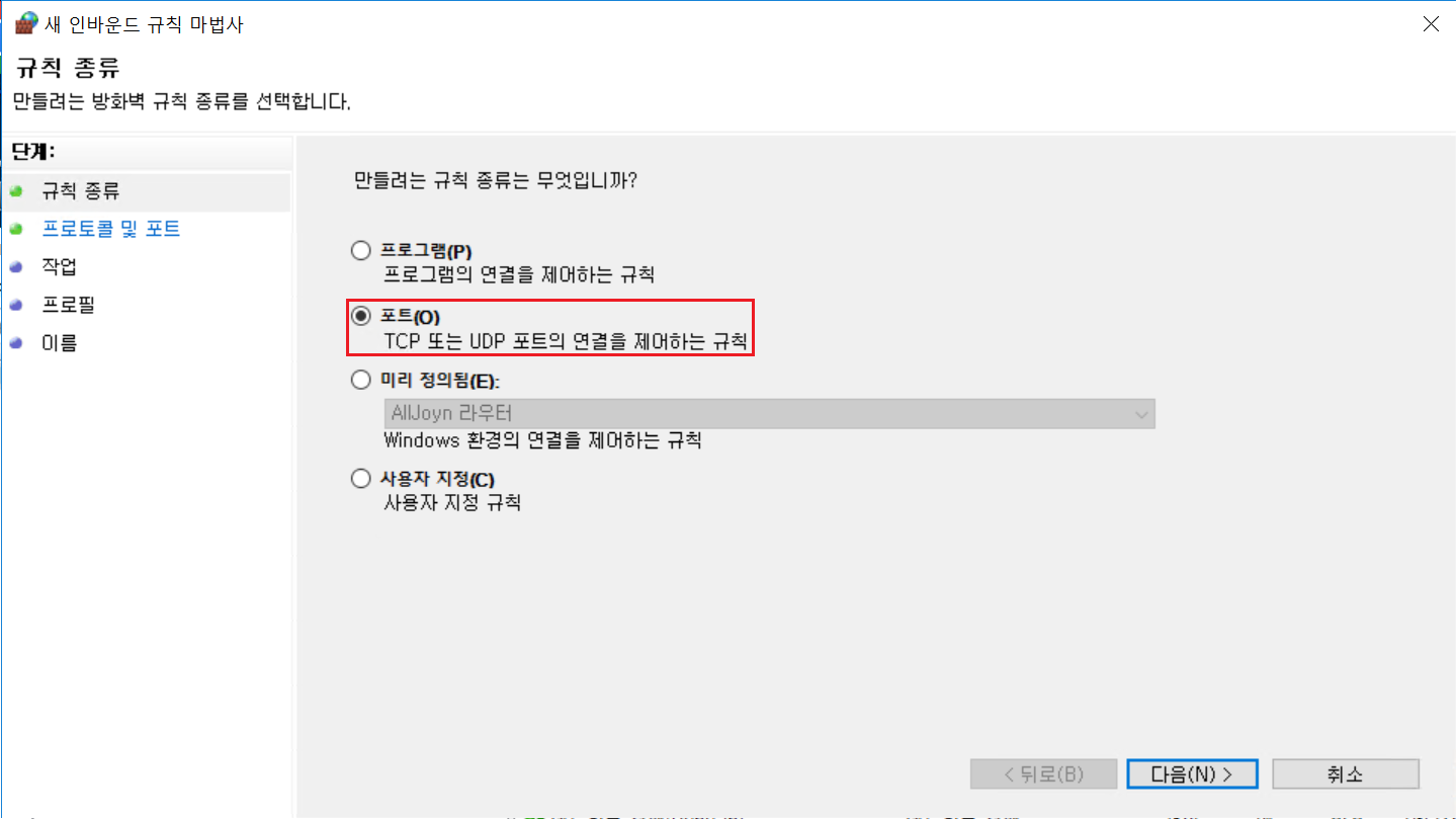 wf.msc 실행 -> 인바운드 규칙 -> 새 규칙