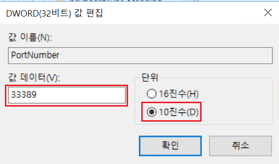 PortNumber를 더블클릭 해서 편집합니다. 10진수에 체크하고 3389 대신 변경할 포트번호인 33389를 넣어주세요.