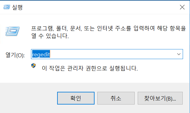 2. 실행 regedit 입력 후 확인