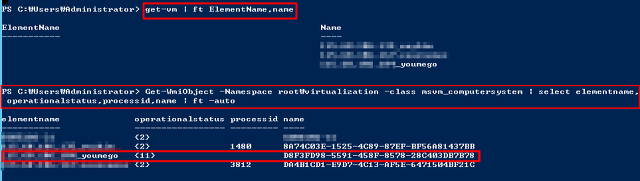 > Get-WmiObject -Namespace root\virtualization -class msvm_computersystem | select elementname, operationalstatus, processid, name | ft -auto