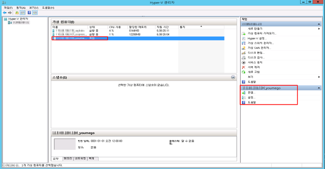 아래 사진을 보면, hyper-v 관리자에서 현재 종료된 상태이며 삭제를 하려 했으나, 설정에서 먹히지 않은 상황입니다.