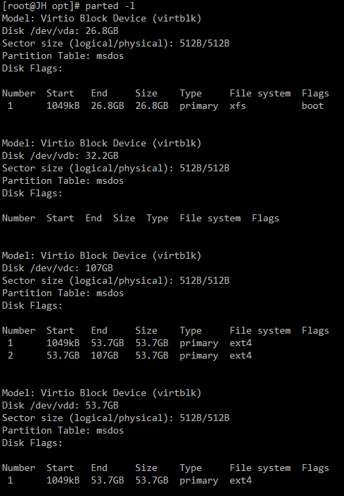 /dev/vdd1 ext4 50G 53M 47G 1% /opt