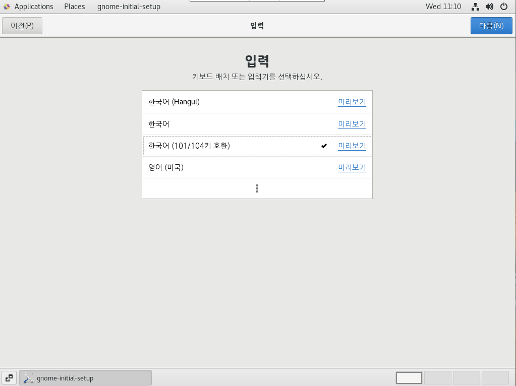 한국인이고 기본 키보드를 쓰신다면 한국어 (101/104키 호환)을 선택하고 다음을 누릅니다.