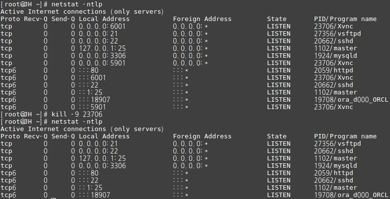 [root@JH ~]# kill -9 23706 터미널 PID 강제종료 보안상 VNC로 누군가 접속할 수 있기때문에 종료를 해줍니다.